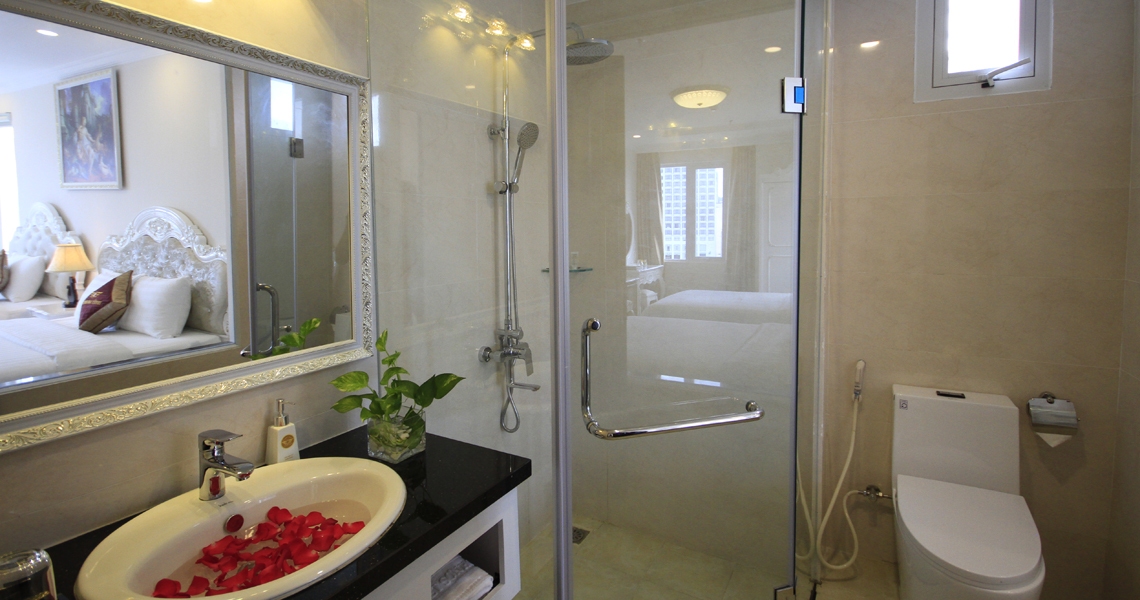 - Phòng tắm được lát đá sang trọng, buồng tắm đứng để quý khách được thư giãn