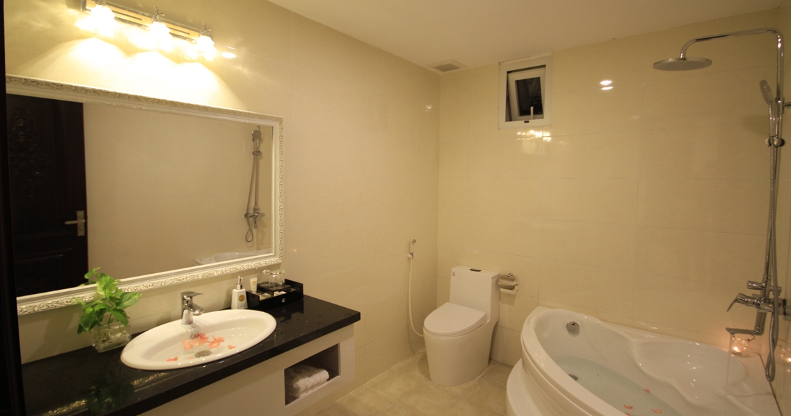 - Phòng tắm được bài trí theo tiêu chuẩn châu Âu, có cửa sổ rất ấn tượng, màu sắc trang nhã cao cấp với bồn tắm nằm và rèm che kín đáo giúp Qúy khách thư giãn tối đa