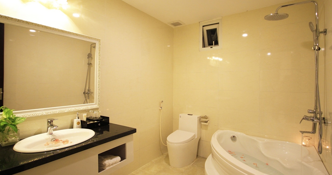 - Phòng tắm được lát đá sang trọng, tiện nghi, với bồn tắm nằm có rèm che để quý khách được thư giãn tối đa nhất