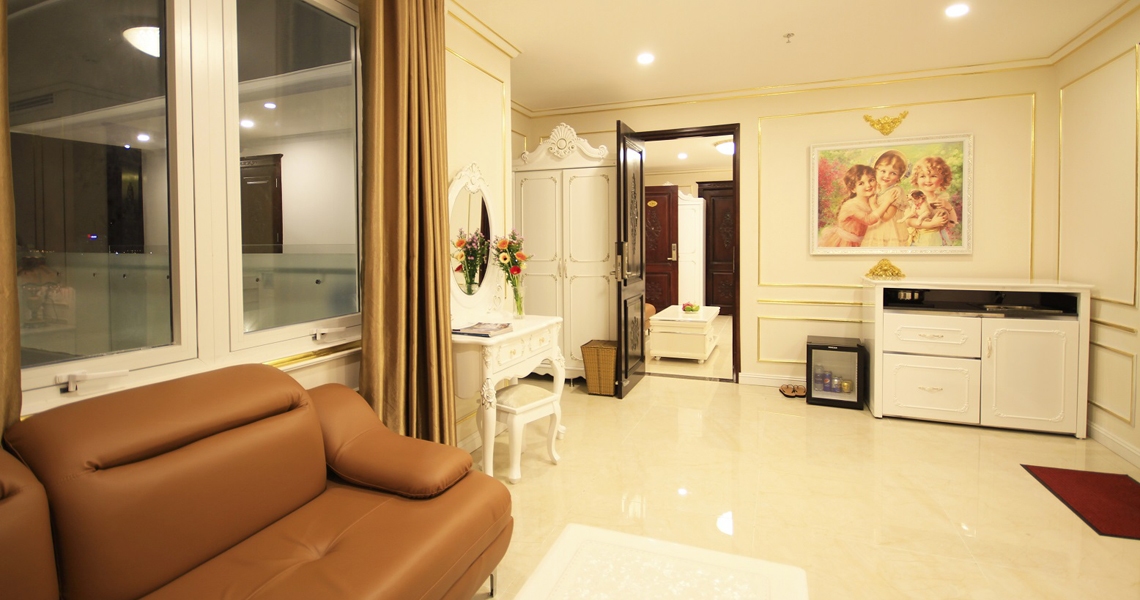 - Có phòng ngủ riêng với giường 1,8m và 1,4rộng rãi và bàn trang điểm ấn tượng, thanh lịch và êm ái , liền kề là khu vực tiếp khách riêng biệt với salon và bàn đá đẳng cấp, lịch sự rất thoải mái để tiếp khách